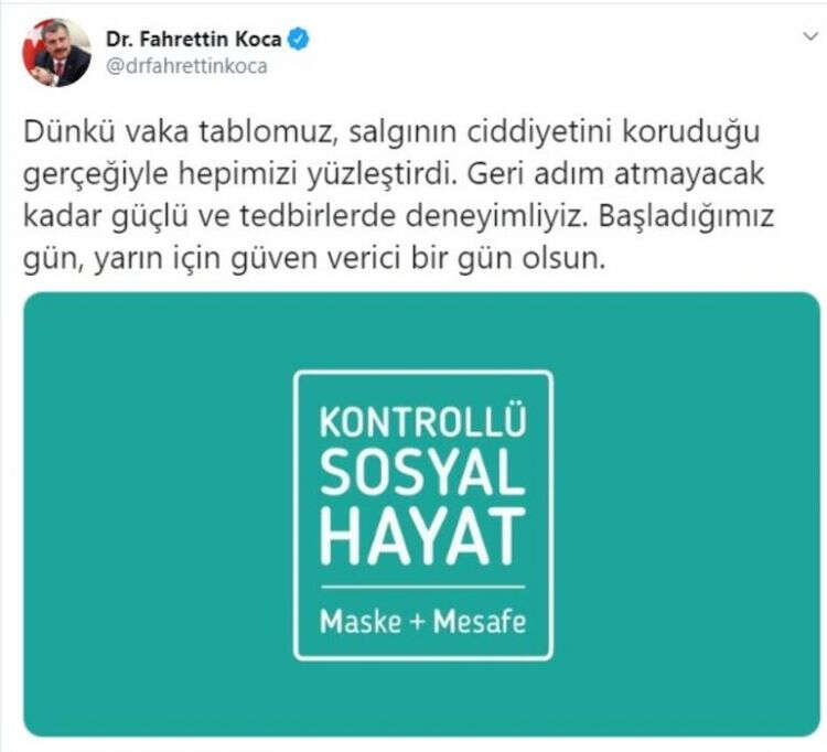 "Dünkü vaka tablomuz, salgının ciddiyetini koruduğu gerçeğiyle hepimizi yüzleştirdi. Geri adım atmayacak kadar güçlü ve tedbirlerde deneyimliyiz. Başladığımız gün, yarın için güven verici bir gün olsun."