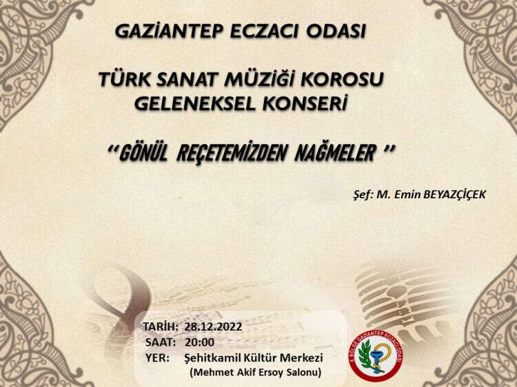 Gaziantep Eczacı Odası tarafından Türk Sanat Müziği Korosu Geleneksel Konser düzenleniyor.