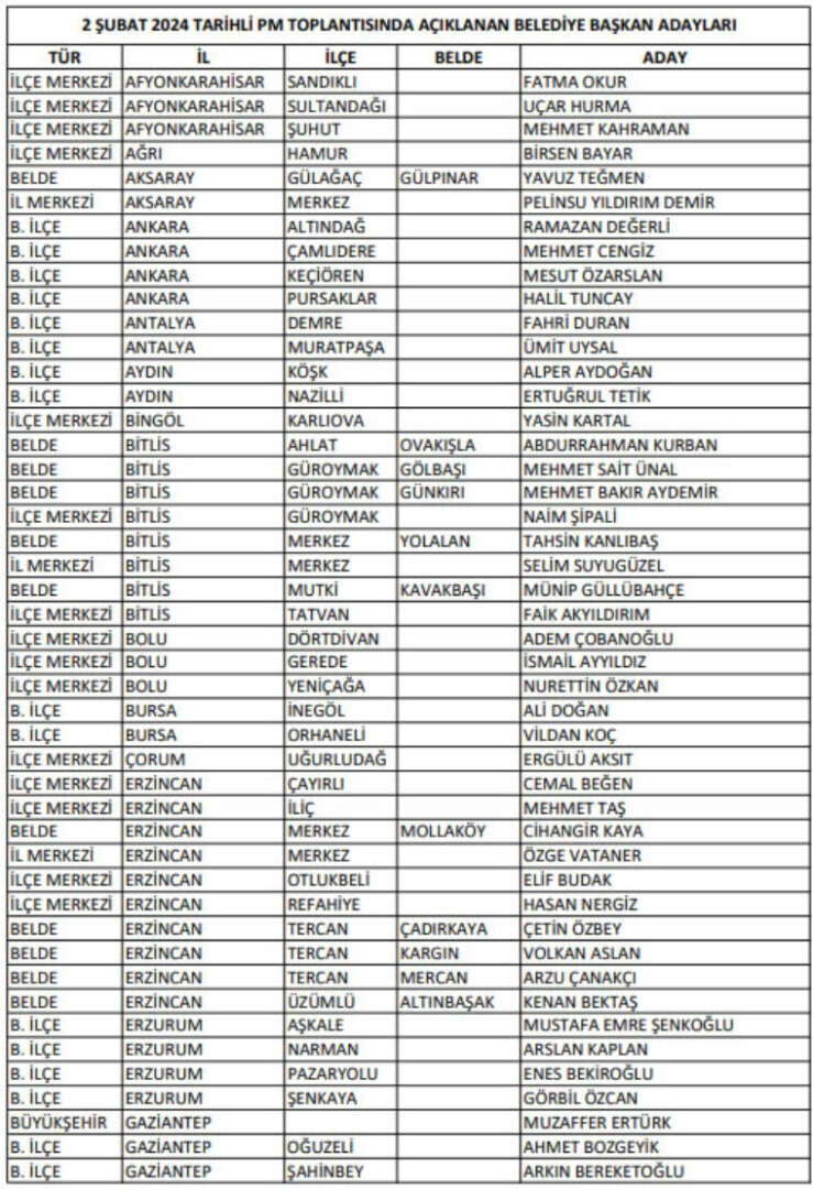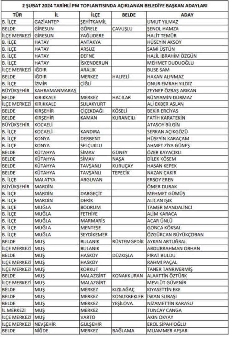CHP, DEM Parti'den Ahmet Türk'ün aday gösterildiği Mardin Büyükşehir Belediye Başkanlığı'na ise Ömer Durak’ın aday gösterdi. İstanbul ilçeleri ve Çankaya, bir sonraki PM'ye kaldı.