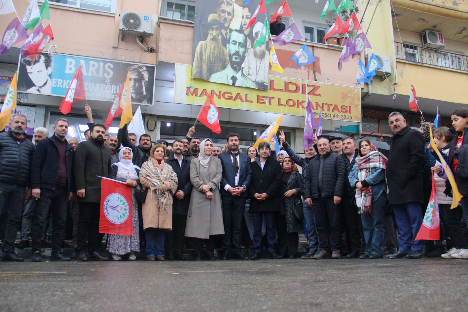 Eş Başkan Adayı Hoşyar Sarıyıldız ise “Biz halkımızın arasında, halkımızla birlikte halkımızın iradesine sahip çıkacağız. Kayyum politikalarıyla halkımızın iradesini gasp eden faşizme karşı en güçlü cevabı seçim günü vereceğiz” dedi.