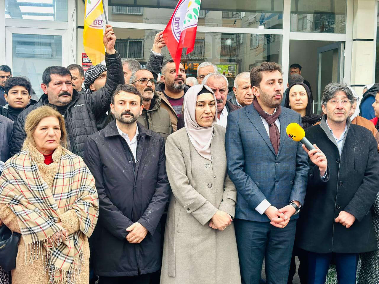 DEM Parti Akdeniz İlçe Binası önünde halkla buluşan eş başkan adayları ve il eş başkanları partililere hitaben kısa konuşmalar yaparak seçim startını verdiler.