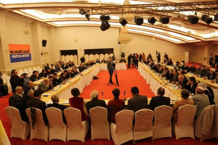 "Tifaqa mayinde, azadiyek mayinde/Kalıcı birlik, kalıcı özgürlük” yazılı pankartların asıldığı çalıştay, Ayşe Gökkan, Murat Bozdemir ve Naim Sabrioğlu’nun moderatörlüğünde başladı.