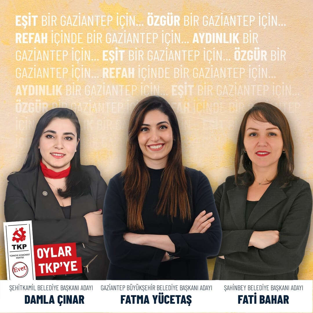 TKP Büyükşehir Belediye Başkan Adayı Fatma Yücetaş, Şahinbey adayı Fati Bahar ve Şehitkamil Adayı Damla Çınar, eşit olmayan, adaletsiz seçim sistemine rağmen, mücadeleden yılmadan seçim çalışmalarını sürdürüyorlar.