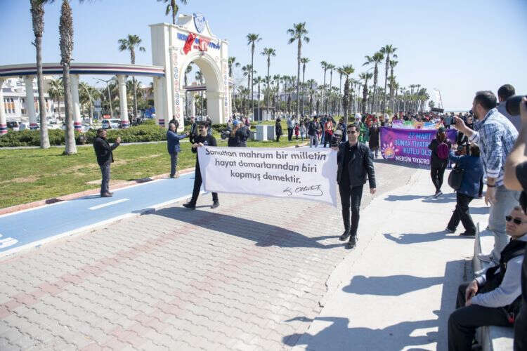 Mersin Şehir Tiyatrosu ekibinin katıldığı yürüyüşte Büyükşehir Belediyesi Kültür ve Sosyal İşler Dairesi Başkanlığı Koordinatörü ve Opera Sanatçısı Bengi İspir Özdülger ile Mersin Şehir Tiyatrosu Genel Sanat Yönetmeni Murat Atak da yer aldı. Büyükşehir Belediyesi Bandosu öncülüğünde başlayan kortej yürüyüşüne Mersin Şehir Tiyatrosu ekibi, Ulu Önder Mustafa Kemal Atatürk’ün “Sanattan mahrum bir milletin hayat damarlarından biri kopmuş demektir” sözünün yazılı olduğu pankartla katıldı.