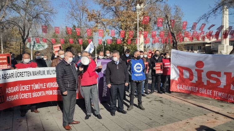 GAZİANTEP- BEKİR ŞAHİN; DİSK Gaziantep Bölge Temsilcisi Ali Güdücü Türkiye’nin dört bir yanında, 2021 asgari ücretine dair talepleri bir kez daha tekrarladıklarını belirterek, “Ülkemizde asgari ücret antidemokratik bir biçimde belirlenmektedir. Çoğunluğu hükümet ve işveren temsilcilerinin oluşturduğu Asgari Ücret Tespit Komisyonu’nda karar oyçokluğu ile alınıyor ve kesin nitelik taşıyor. Bir yandan ekonomik kriz bir yandan da Covid-19 salgınının yarattığı ağır bedellere karşı ülkeyi yönetenlere çağrımızdır. Bizler Sefalet ücreti istemiyoruz. 2021 asgari ücreti net 3.800 TL olarak saptanmalıdır” dedi.