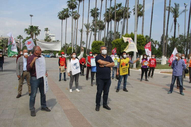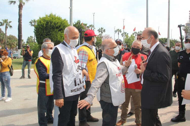 Burada yapılan ortak açıklamayı Emek ve Demokrasi Platformu sözcüsü DİSK Genel İş Şube Başkanı Kemal Gürsoy yaptı. Alana giriş öncesinde sağlık ve sosyal hizmet emekçileri Sendikası Mersin şubesi bir önceki dönem eş başkanı olan Yılmaz Bozkurt tarafından, salgın günlerinde büyük bir risk altında çalışmaya devam eden sağlık emekçilerinin çalışma koşulları ile ilgili kısa bir konuşma yapıldı.