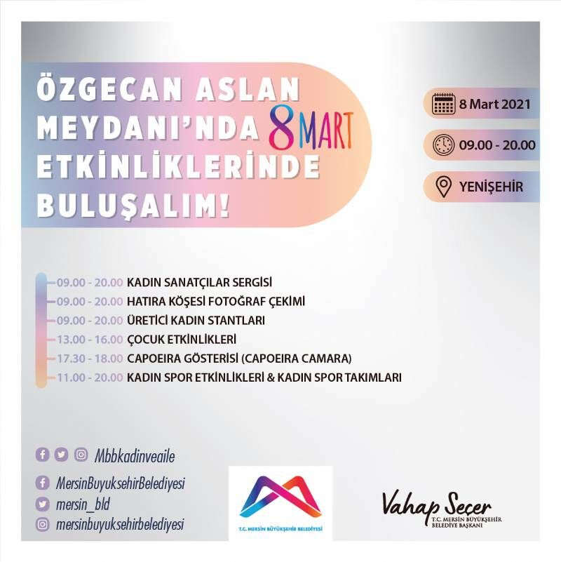 MERSİN- YENİ ÇİZGİ; Mersin Büyükşehir Belediyesi Kadın ve Aile Hizmetleri Dairesi’nin öncülüğünde 8 Mart Dünya Emekçi Kadınlar Günü dolayısıyla Özgecan Aslan Barış Meydanı’nda bir kutlama programı yapılacak. Sabah 09.00’da başlayacak program 20.15’e kadar devam edecek. Büyükşehir, programın içerik ve saatlerini sosyal medya hesaplarında ayrıntılı bir şekilde paylaştı.