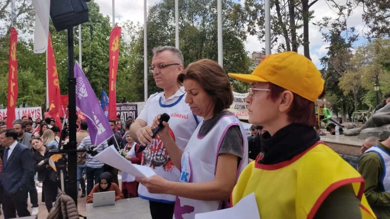 “işçilerin, kamu emekçilerin, gençlerin, kadınların, emeklilerin, çocuklarımızın geleceği için tarihsel bir dönemde kol kola omuz omuzayız. Yasakları yıkmak için buradayız. Hakları için, adalet ve demokrasi için, barış için mücadele eden işçiler, emekçiler, gençler, kadınlar için alandayız. Hayatın her alanında bizlere reva gördükleri kayyum düzeni, ihraçlar, adaletsizliktik, cezaevlerinde insanlık dışı uygulamalar, gözaltı operasyonlarına dur demek için buradayız” dedi. Güdücü, şirket gibi yönettikleri ülkeyi salgında ekonomik krizde en ağır bedelleri biz ödedik. Bizden hellalik istediler, haram olsun hakkımız” dedi.