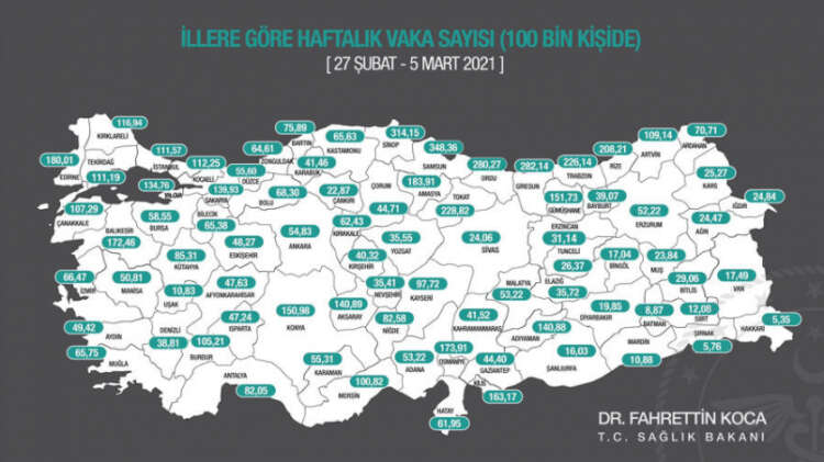 Sağlık Bakanı Koca, 27 Şubat-5 Mart haftasında illere göre 100 bin kişiye düşen Kovid-19 vaka