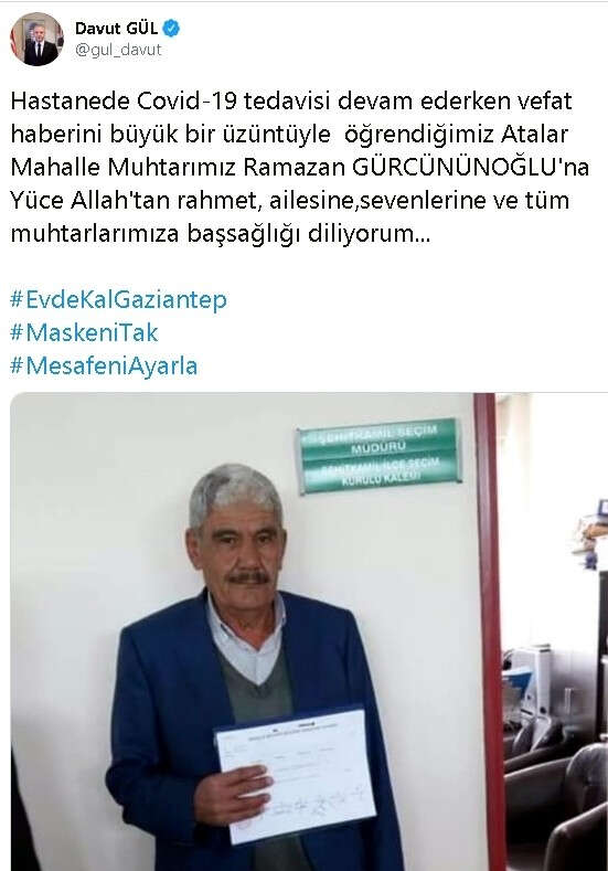 Gaziantep'te bir süre önce korona virüs (covid 19) salgınına yakalanan ve test sonuçları pozitif çıkan Şehitkamil ilçesine bağlı Atalar Mahalle Muhtarı Ramazan Gürcününoğlu, tedavi gördüğü hastanede hayatını kaybetti. Sosyal medya hesabından Muhtar Gürcününoğlu'nun vefatını duyuran Gaziantep Valisi Davut Gül, "Korona Hastanede Covid-19 tedavisi devam ederken vefat haberini büyük bir üzüntüyle öğrendiğimiz Atalar Mahalle Muhtarımız Ramazan Gürcününoğlu'na Yüce Allah'tan rahmet, ailesine,sevenlerine ve tüm muhtarlarımıza başsağlığı diliyorum" paylaşımını yaptı.