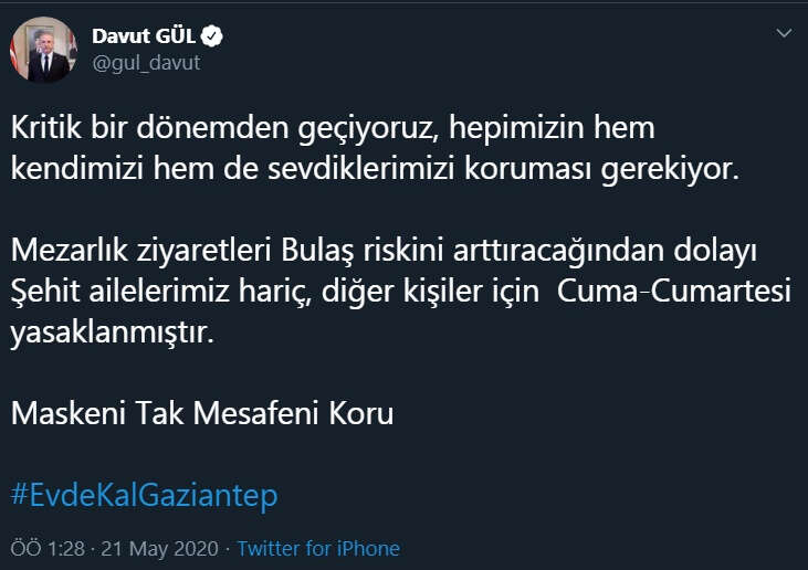 Gaziantep Valisi Davut Gül'ün Attığı Twit Paylaşımındaki Açıklamasına Göre:Mezarlık ziyaretleri Bulaşma riskini arttıracağından dolayı Şehit ailelerimiz hariç, diğer kişiler için Cuma-Cumartesi yasaklanmıştır.