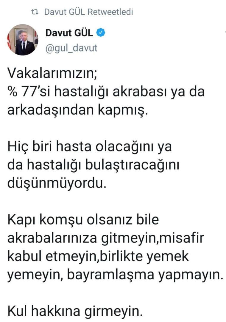 Gül, sosyal medyadan yaptığı başka bir uyarıda ise korona virüs vakalarının yüzde 77'sinin akraba ve arkadaştan bulaştığını hatırlatarak, Ramazan Bayramı boyunca insanların temastan kaçınması istedi. Vali Gül, paylaşımında, "Vakalarımızın yüzde 77’si hastalığı akrabası ya da arkadaşından kapmış. Hiç biri hasta olacağını ya da hastalığı bulaştıracağını düşünmüyordu. Kapı komşu olsanız bile akrabalarınıza gitmeyin,misafir kabul etmeyin,birlikte yemek yemeyin, bayramlaşma yapmayın" ifadelerine yer verdi.