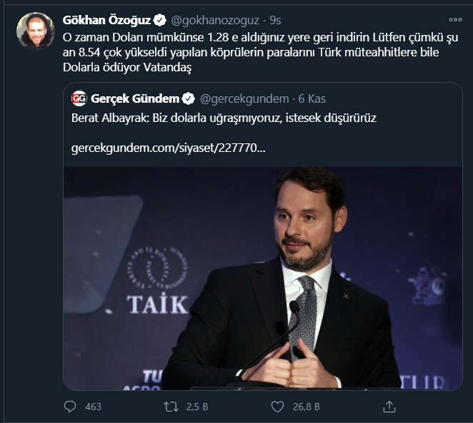"O zaman Doları mümkünse 1.28 e aldığınız yere geri indirin Lütfen çünkü şu an 8.54 çok yükseldi yapılan köprülerin paralarını
