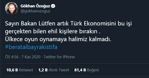 Özoğuz sosyal paylaşım sitesi Twitter'dan Hazine ve Maliye Bakanı Berat Albayrak'a istifa çağrısında bulunarak iki paylaşımda bulundu.