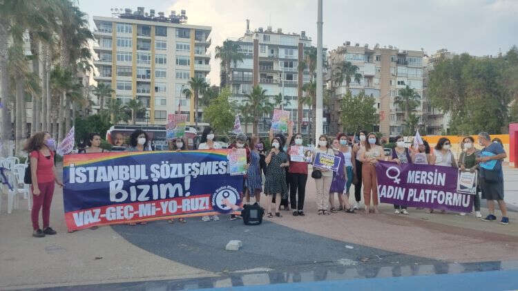 MERSİN- BEKİR ŞAHİN; Mersin Kadın Platformu, İstanbul Sözleşmesi nöbetinde kadın katillerinin devlet tarafından korunduğunu ileri sürerek, öldürülen kadınlar için adalet taleplerini yineleyerek cezasızlıklara tepki gösterdiler. “Kadınlar adalet istiyor. Çünkü kadınlar sadece erkek şiddetinden ölmüyor, her ölen kadının arkasından iyi hal indirimi” var diye tepki gösterdiler. Kadınlar, katledilen Feray Şahin’e, Nadira Kadirova’ya, Yeldana Kaharman’a, Gülistan Doku’ya, Rabia Naz’a ne oldu diyerek sordu, cezasızlıklara tepki gösterdi.