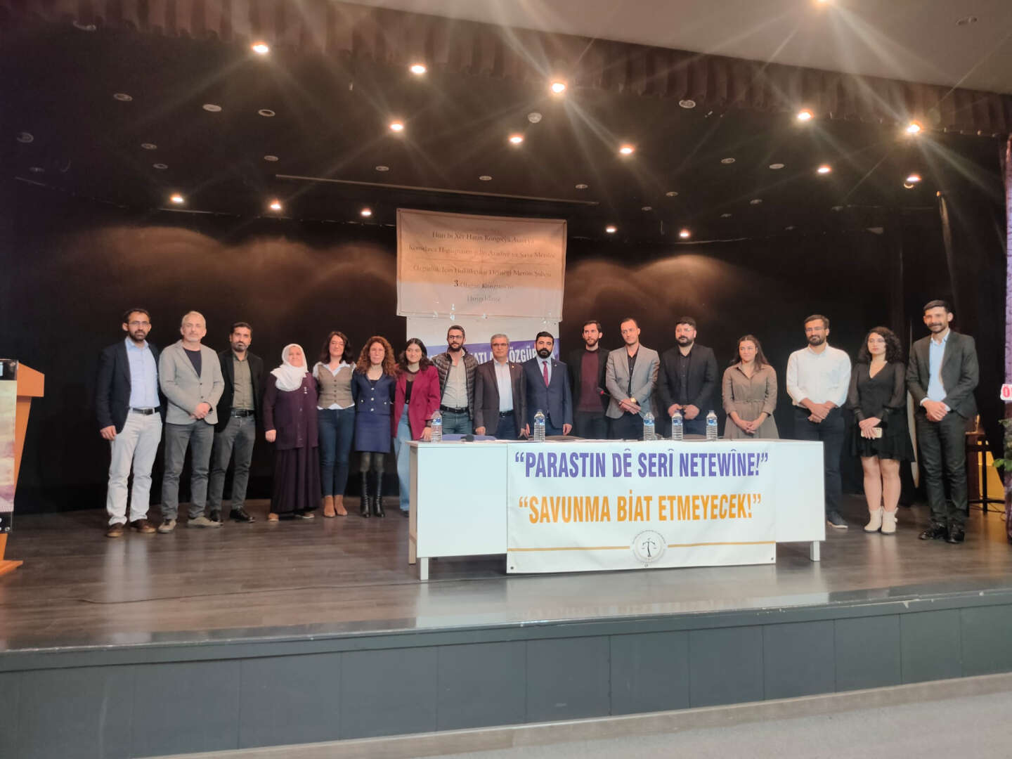 “Savunma biat etmeyecek” Türkçe ve Kürtçe yazılı pankartın asıldığı kongrede Divan oluşumundan sonra, saygı duruşu ile başlayan kongrede yapılan konuşmalarda, Kürt Sorunu’nun çözümü için sürdürülen ‘Barış Nöbeti’ ve cezaevlerindeki açlık grevine dikkat çekildi, aynı zamanda tecridin sonlandırılması çağrısında bulunuldu.