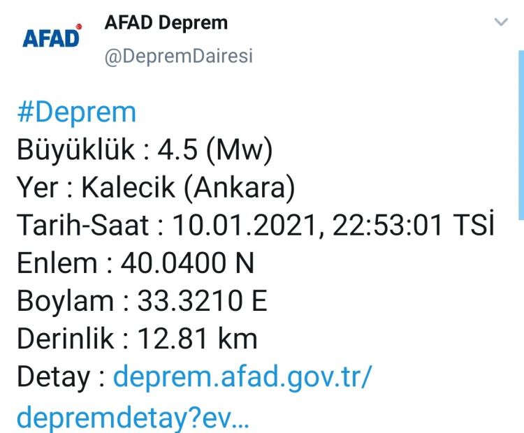 Ankara’nın Kalecik ilçesinde 4.5 büyülüğünde bir deprem meydana geldi. Saat 22.53'de meydana gelen depremin yerin 12,8 km derinliğinde olduğu belirtildi.